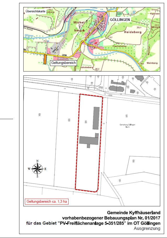 Im Ergebnis des gesetzlich durchgeführten Planverfahrens zum vorhabenbezogenen Bebauungsplan Nr. 01/2017 „PV-Freiflächenanlage Am Schacht 5-351/285“ im Ortsteil Göllingen der Gemeinde Kyffhäuserland hat der Gemeinderat der Gemeinde Kyffhäuserland in seiner Sitzung am 12.09.2024 den Abwägungs- und Satzungsbeschluss gefasst.
